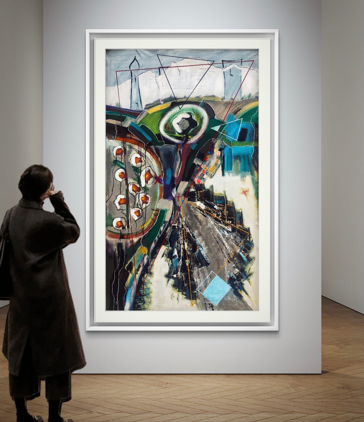 A work suspended between tragedy and hope. the informal painting is integrated with military map graphics, religious symbols and flowers between mourning and rebirth.